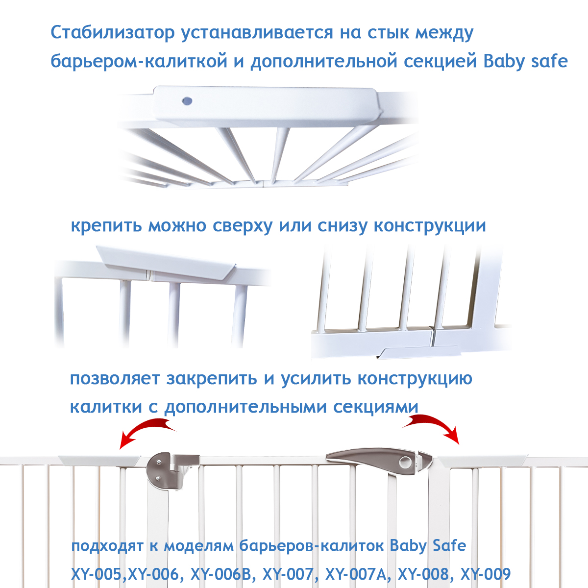 Здравствуйте, есть стабилизатор черного цвета? Здравствуйте. Рекомендуем использовать фильтр для поиска товара на сайте или в мобильном приложении.Для расширителя 7 см не нужен? Здравствуйте, необходимо докупать расширитель шириной от 10 или 14 см.Для лучшей устойчивости одевается сверху и снизу? Тли предназначен только сверху? Здравствуйте. Стабилизатор соединения Baby Safe XY-023 предназначен для усиления конструкции барьера-калитки и дополнительных секций, особенно при установке в широкие проёмы.