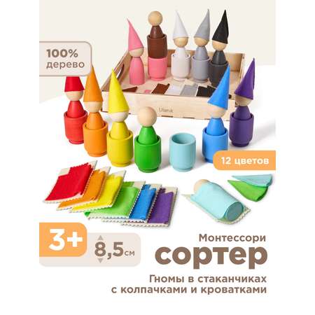 Игра открытого типа, разработанная в соответствии с образовательной системой Монтессори. Гномиков можно наряжать в колпачки, выстраивать фигурки в последовательности, а также разыгрывать сюжетные сценки.