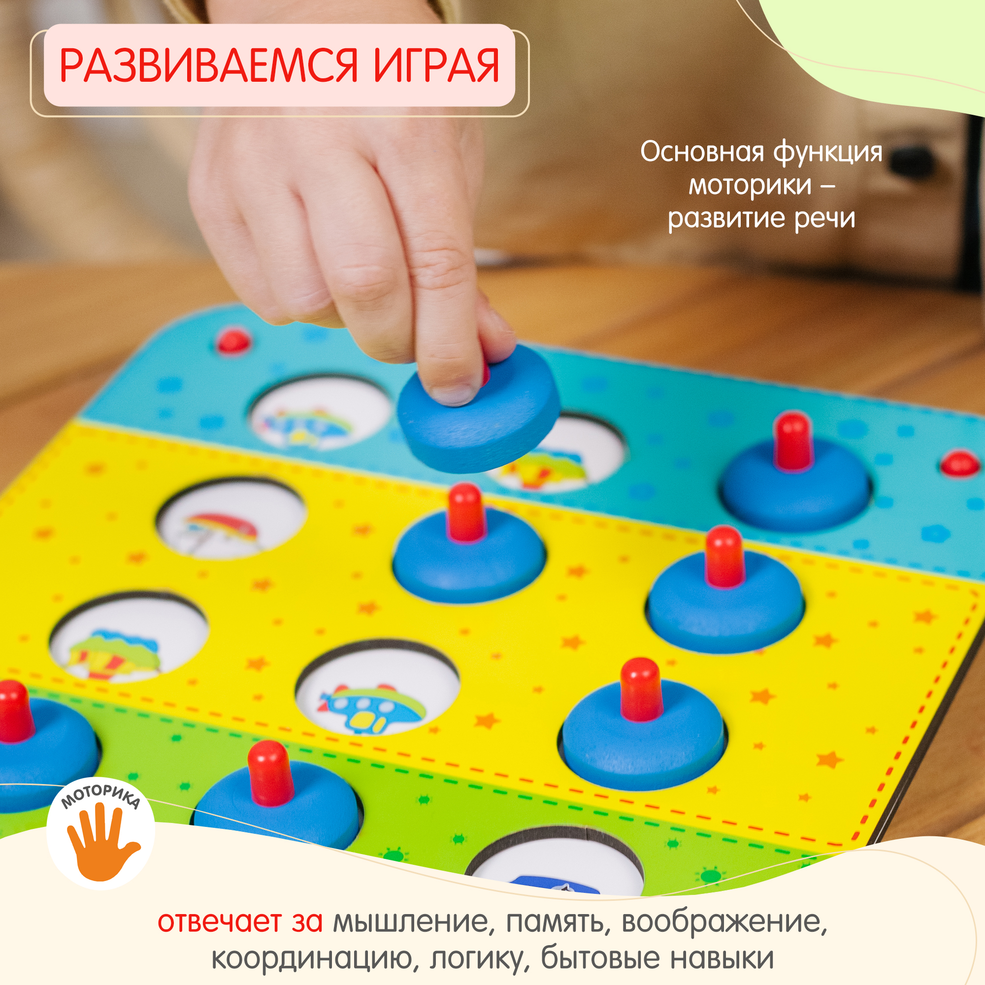 * Картинки скрыты деревянными фишками. Задача игроков: открывая по 1 фишке, найти пару. Эта игра увлекательная и полезная в обучении ребенка.