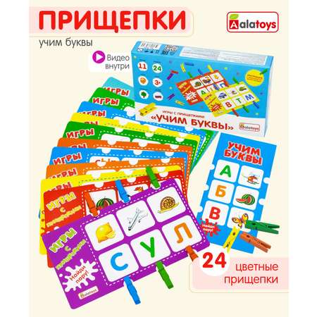 Настольная детская игра УЧИМ БУКВЫ с прищепками (10 карточек, 24 прищепки) Алатойс деревянная развивающая + гайд с играми