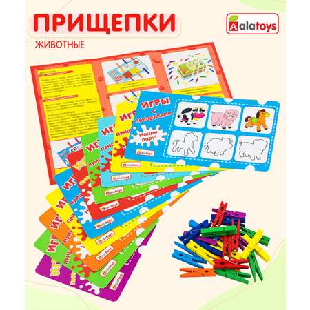 Настольная игра с прищепками (10 карточек, 24 прищепки) ЖИВОТНЫЕ Алатойс развивающая деревянная Монтессори + гайд с играми