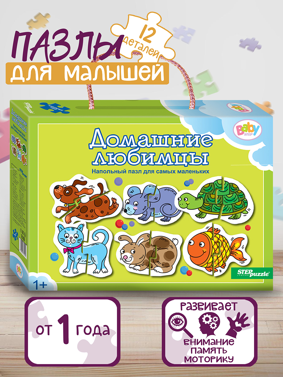 Этот пазл предназначен для малышей от одного года. В его комплект входят шесть картинок с изображениями домашних питомцев - кошки, собачки, рыбки, черепахи, мышки и кролика. Каждая картинка состоит из двух деталей-пазлов. Детали крупные - их размер колеблется от 9,5х4,5 см до 14х6 см. Чтобы ребёнку было проще собирать картинки, на коробке с пазлами размещены изображения питомцев.