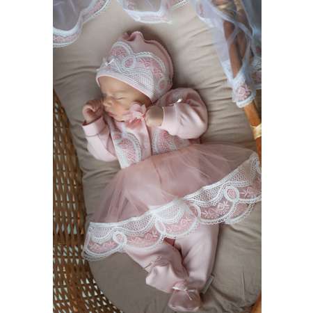 Очаровательный комплект для новорожденных принцесс с нежным кружевом идеально подойдёт на выписку из роддома и для первой фотосессии малышки. Нательный комплект выполнен из 100% хлопка высочайшего качества (интерлок) и состоит из комбинезона-платья и стильной шапочки с вуалькой. Комбинезон-платье с пышной кружевной юбкой, застегивается на удобные , плоские кнопки ,что позволяет быстро и без усилий при необходимости переодеть малышку и декорирован кружевом и бантиками . Данный комплект понравится малышке , а особенно будущей маме, которая оценит его красоту и практичность, потому что комплект можно использовать не только на выписку, но и для повседневной носки. Праздничная и в то же время комфортная модель идеальна для выписки из роддома новорожденного малыша ,так как упакована в подарочную коробку. Состав:100% хлопок, отделка:кружево. Цвет: Розовый.