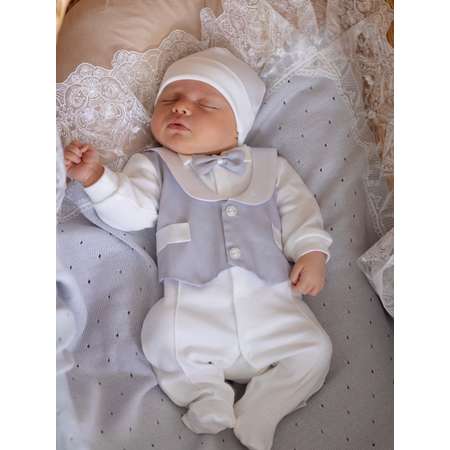 Потрясающий комплект для новорожденных мальчиков в классическом стиле с жилеткой и элегантной бабочкой идеально подойдёт на выписку из роддома и для первой фотосессии малыша. Нательный комплект из 100% хлопка , состоит из комбинезона и шапочки. Комбинезон для новорожденных имеет удобную застежку на кнопки спереди ,что позволит без особых усилий переодеть малыша. Данный комплект особенно понравится будущей маме, которая ценит красоту и практичность, потому что комплект можно использовать не только на выписку, но и в качестве подарка для новорожденного , и для повседневной носки. Праздничная и в то же время комфортная модель идеальна для выписки из роддома новорожденного малыша. Сшито с любовью о самых маленьких!Цвет:Серый-Экрю. Состав:100% Хлопок.