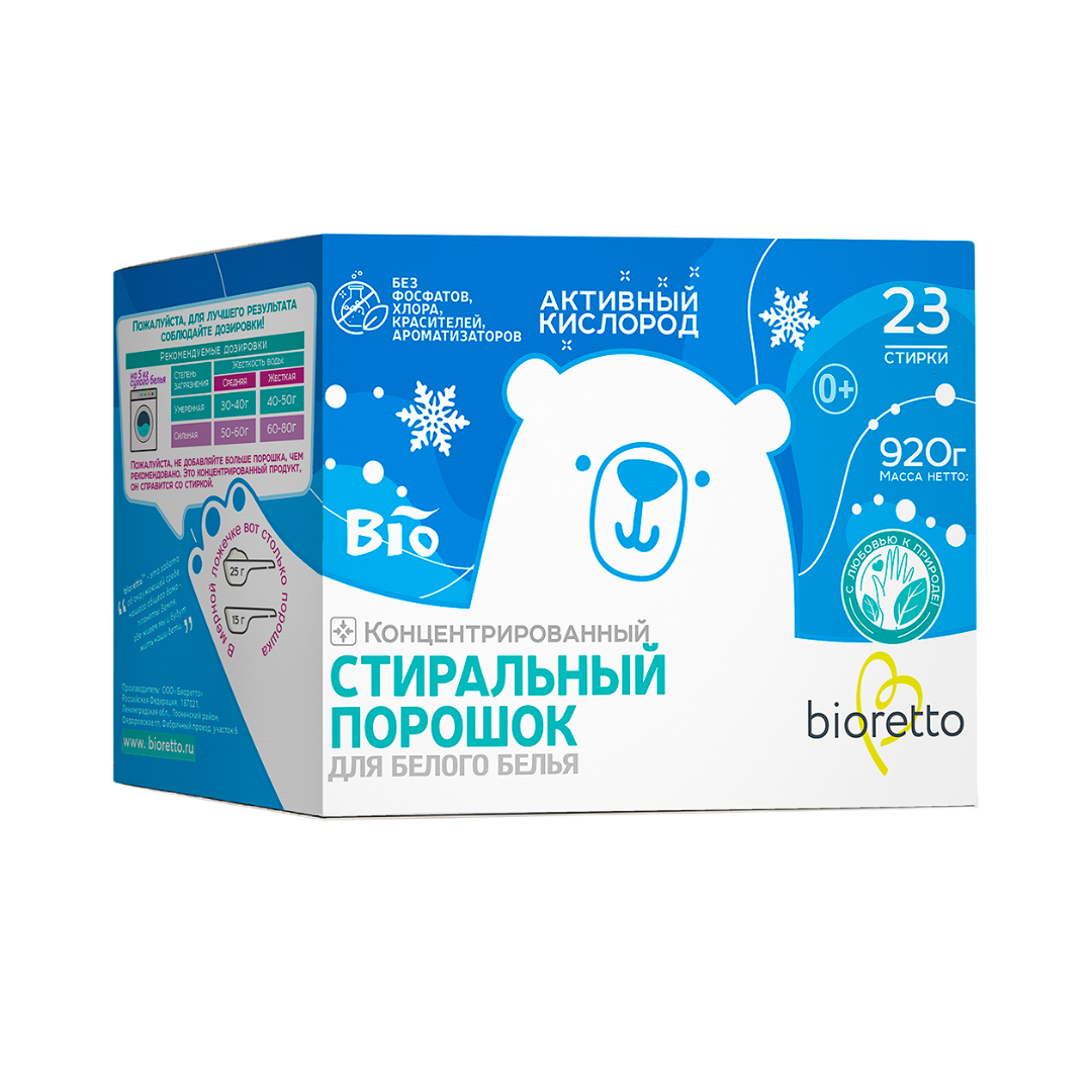Экологичный концентрированный стиральный порошок для белого белья bioretto эффективно и бережно очистит одежду от загрязнений, пятен и запахов.