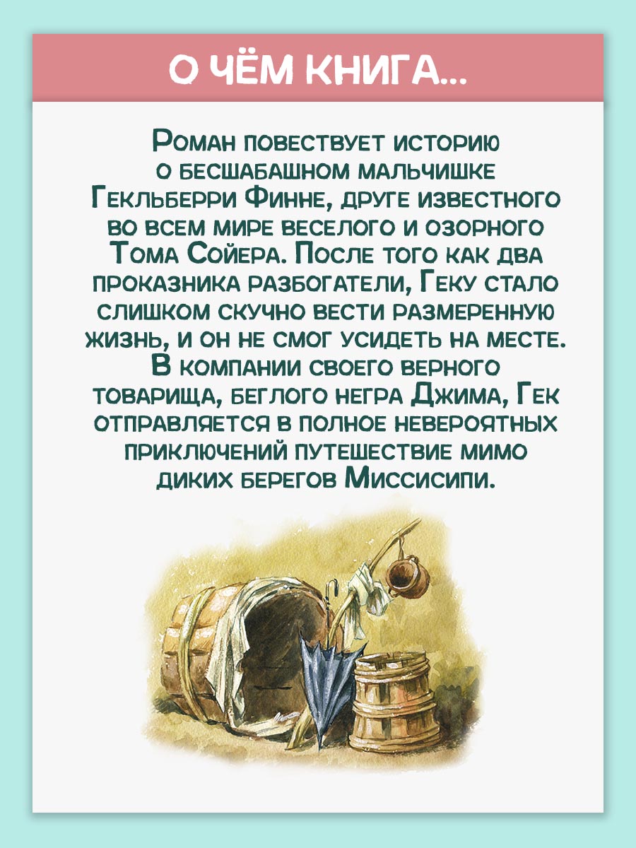 Книга Марка Твена, которая называется „Приключения Гекльберри Финна“- является продолжением другой, не менее известной книги писателя - "Приключения Тома Сойера". В этих книгах рассказывается о дружбе и веселых проделках двух американских мальчишек. С великолепным писательским мастерством обрисована жизнь небольшого провинциального американского городка в сороковых годах XIX века. Замечательная пересказ для детей младшего школьного возраста в переводе М. Тарловского.