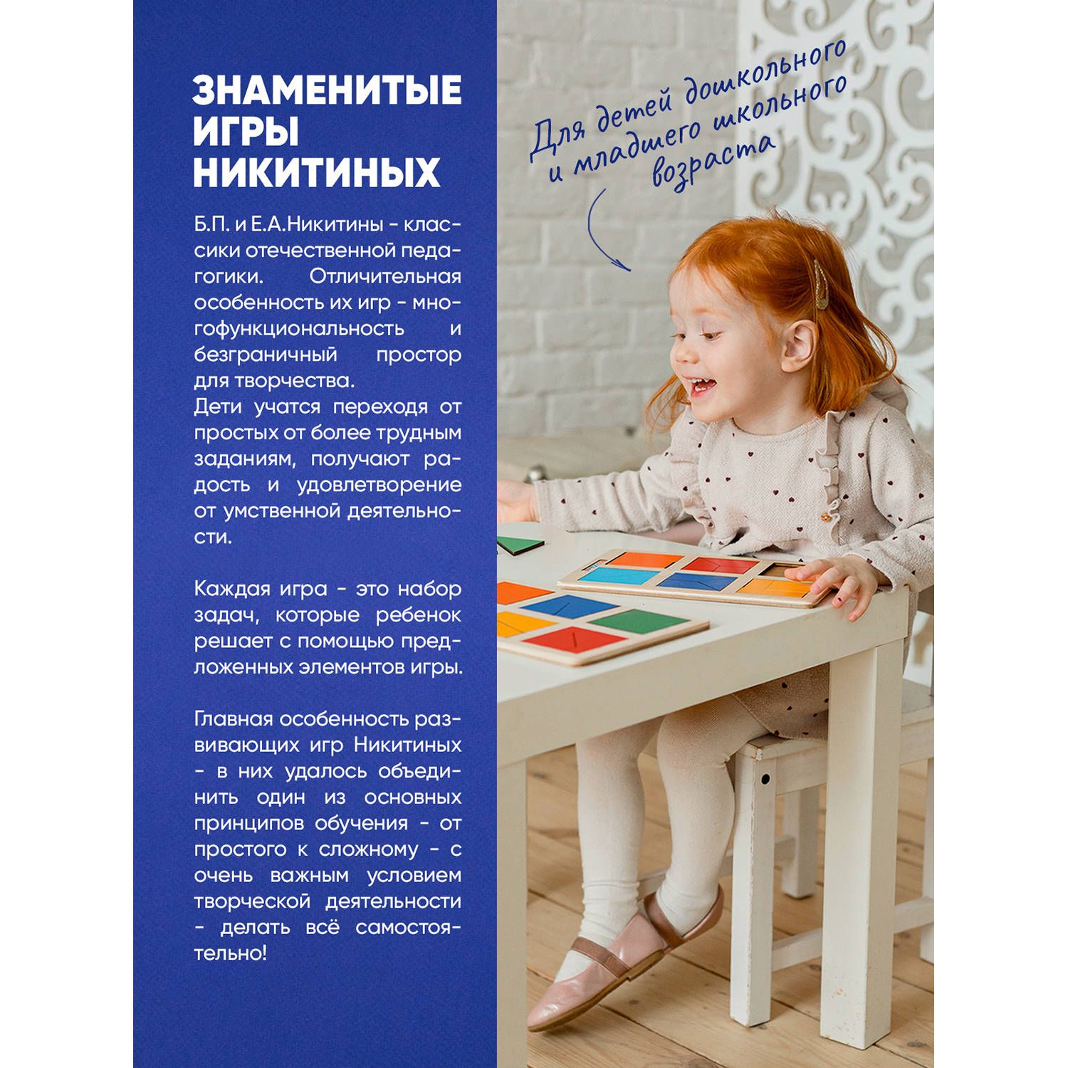 Игра состоит из двух деревянных оснований, квадратными выемками и 30 разноцветных геометрических фигур, окрашенных с одной стороны. Квадраты Никитина способны надолго увлечь ребенка. Головоломка выполнена из экологически чистого и долговечного материала - дерева. Все детали игрушки - качественно обработаны, не имеют острых углов, сколов и зазубрин - окрашены экологичными премиальными красками в яркие цвета радуги. Игра в картонной упаковке приучит малыша к порядку с ранних лет!