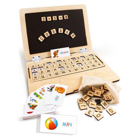 - Ноутбук как настоящий, ребёнку очень нравится. Все детали закруглены и хорошо отшлифованы. Для букв есть отдельный мешочек, в него мы учимся складывать все буквы. Карточки помогают учиться читать, что очень удобно. Все детали хорошо примагничиваются.