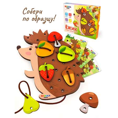 Головоломка выполнена в форме веселого ежика, который ожидает, чтобы ребенок при помощи шнурочка пришил к большому ежику 7 элементов: яблоко, грибок, желудь, грушу и клубнику. Также в комплекте есть три карточки с заданиями и шнурок. Размер ежика составляет 17x12 см, а размер деталей 3x3 см. Игра в подарочной упаковке, размер коробки 21х18х3 см. Все элементы головоломки тщательно отшлифованы и полностью безопасны для детских рук. Играть и обучаться с удовольствием станет ещё интереснее с помощью интересной истории про ежика, которую вы можете придумать вместе с ребенком.