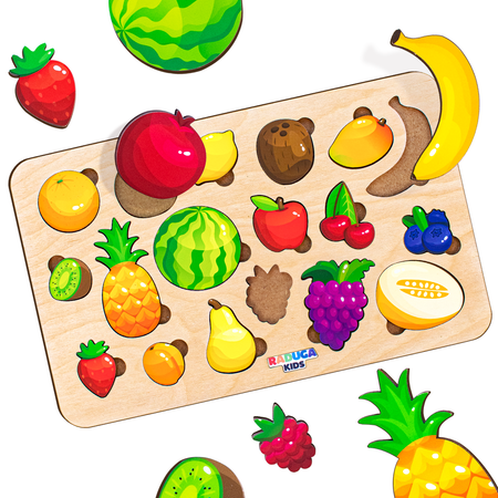 Большая рамка вкладыш для малышей от raduga kids из дерева, которую приятно брать в руки. Наша рамка отличается от аналогов тем, что она не имеет подсказок в виде картинок и ручек которые облегчают игру. Прежде чем вставить предмет в основание ребенку придется покрутить форму и подумать, попытаться самому найти соответствующий фрукт, что усложняет процесс игры - это тренирует мелкую моторику рук и мышление, ребенок вырабатывает навыки самостоятельности и усидчивости. Игрушки для малышей 1 год от года (игра строго под присмотром родителей). Сочная корзинка с фруктами и ягодами станет отличным подарком для малышей от 1 до 3 лет. Развивающая игра для девочек и мальчиков отличный подарок на день рождение. В раннем возрасте с фигурками познавательно изучать цвета и формы, трогать детали, развивая тактильные ощущения.