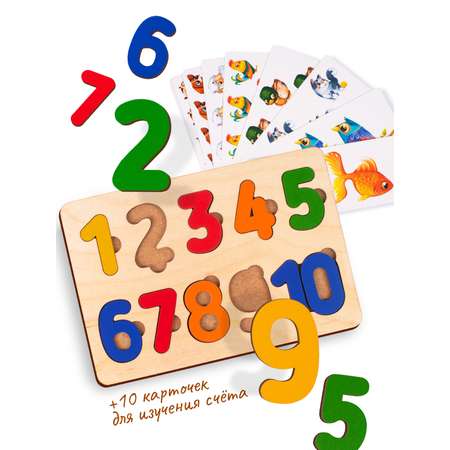 Комплект учим цифры включает в себя 10 карточек с изображениями различных животных и 1 деревянный планшет, на котором размещены цифры, окрашенные с одной стороны. Размеры планшета 25x17x7 см, а размеры карточек – 15 x 7 см.