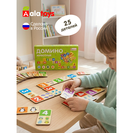 Домино детское деревянное Алатойс Настольная игра для малышей "ЖИВОТНЫЕ" (25 фишек)