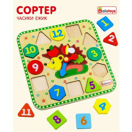 Сортер Монтессори детский деревянный (12 деталей) Алатойс часики для малышей ЁЖИК