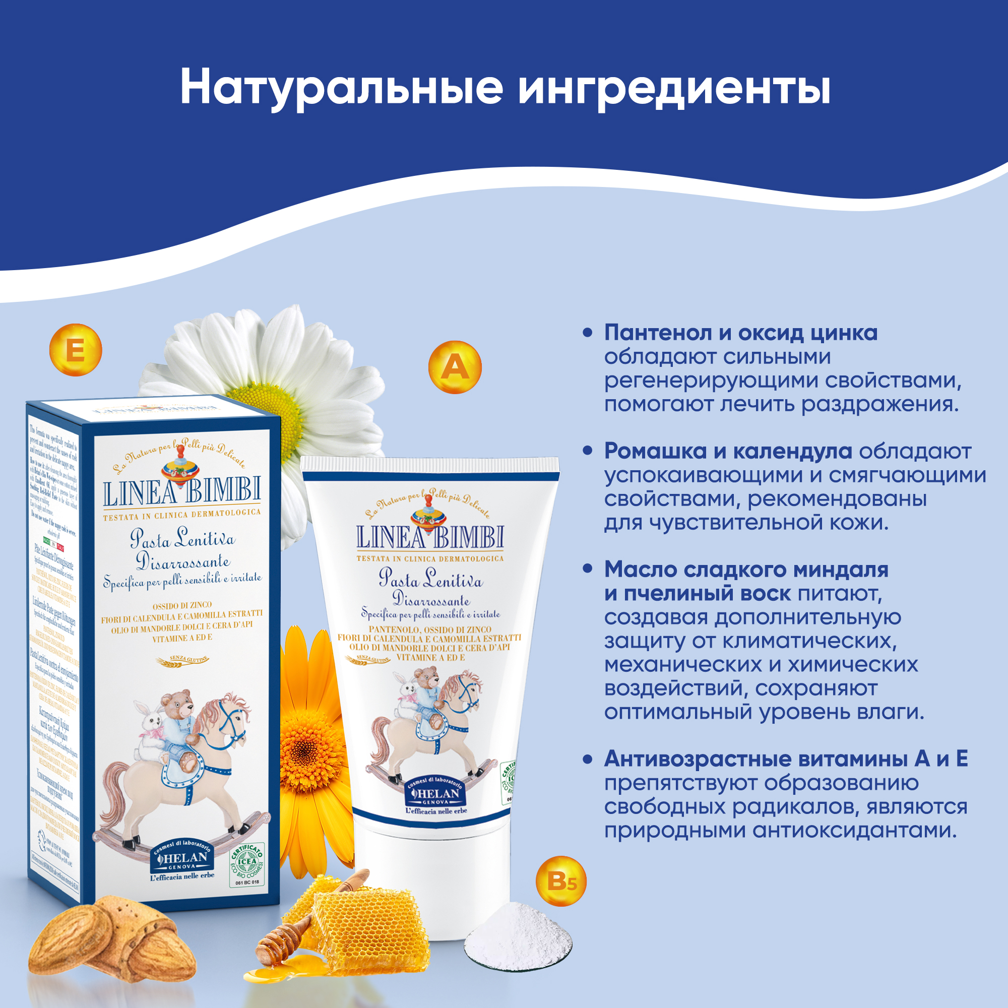 Органический крем HELAN Linea Bimbi специально разработан для предупреждения и борьбы с опрелостями, раздражением и трещинами на коже в зоне пеленания благодаря успокаивающему и регенерирующему действию пантенола, оксида цинка и экстрактов ромашки и календулы. Обогащенный маслом сладкого миндаля, пчелиным воском, витаминами А и Е, смягчающий крем Helan идеально подходит для чувствительной и раздраженной кожи.