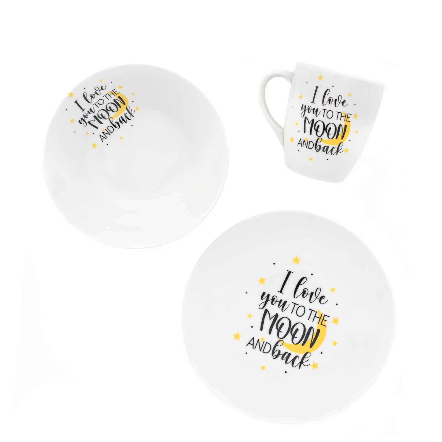 Набор детской посуды "До луны и обратно" - оригинальный подарок для ребенка на любой праздник. Вам больше не нужна отдельная подарочная упаковка для наших столовых сервизов, все наши детские наборы посуды упаковываются в фирменные, крафтовые коробки. Наши детские наборы посуды изготавливаются из высококачественного фарфора. Вся детская посуда нашего бренда производится в России. Наши детские наборы посуды подходят для использования в СВЧ-печах. Мы не рекомендуем использование жестких щеток и губок. Всегда в наличии более 50 различных дизайнерских наборов детской посуды. Детский набор посуды "До луны и обратно" состоит из трех предметов: кружка, тарелка, суповая тарелка. Объем кружки 300 мл, объем суповой тарелки 600 мл, диаметр столовой тарелки 20 см. Столовый сервиз всегда упаковывается в подарочную коробку и дополнительно прокладывается большим количеством пупырчатой пленки и специальными картонными ложементами