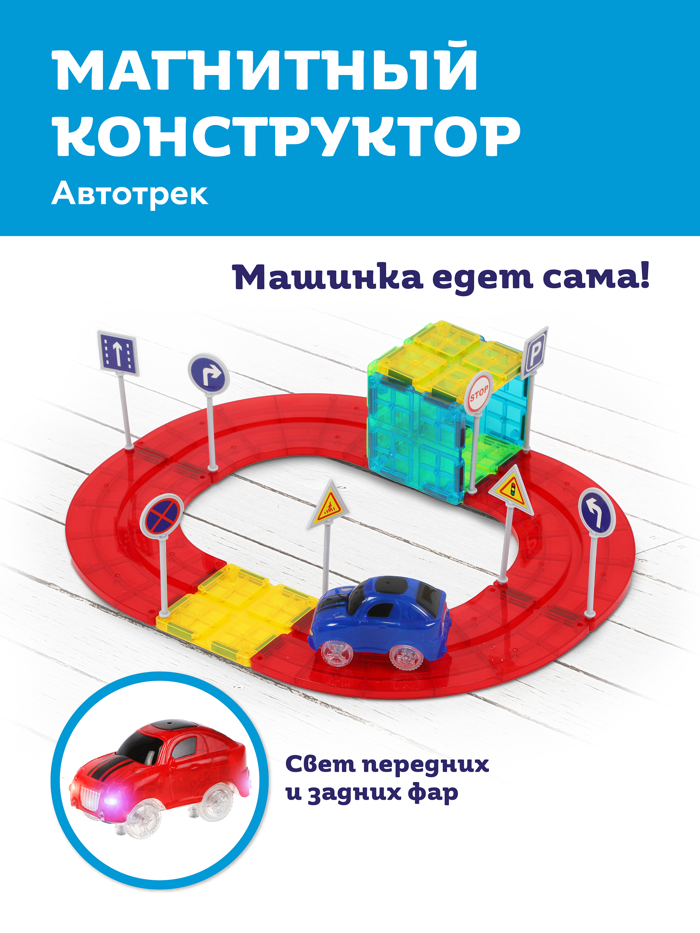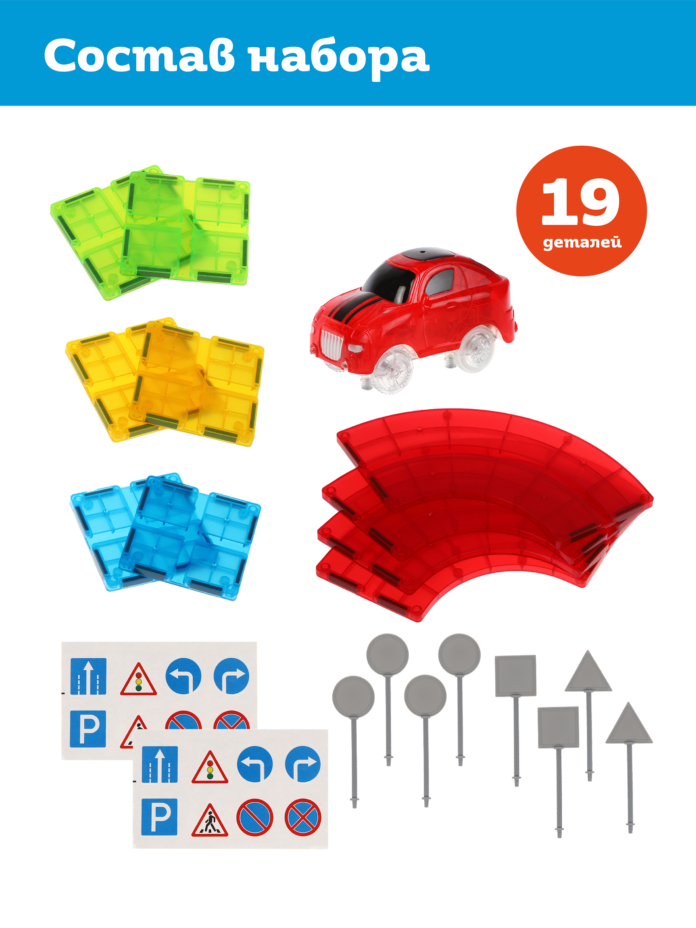Магнитный конструктор от On Time для детей превратит обычную игру в машинки в увлекательную логическую задачу для развития пространственного мышления! В комплекте – 19 деталей, из которых ребёнок сможет построить захватывающий автотрек. Элементы конструктора нужно соединить между собой так, чтобы дорога замкнулась как настоящая гоночная трасса. Машинка, которая также входит в состав игрового набора, будет ездить по кругу с включенными передними и задними фарами. Ребёнок будет с большим удовольствием наблюдать за её движением! Комплектация: 10 магнитных деталей, 1 машинка, 8 дорожных знаков, 2 листа с наклейками. Машина работает от 1-й батарейки типа АА на 1,5 V (не входит в комплект). Материал изготовления: пластмасса.