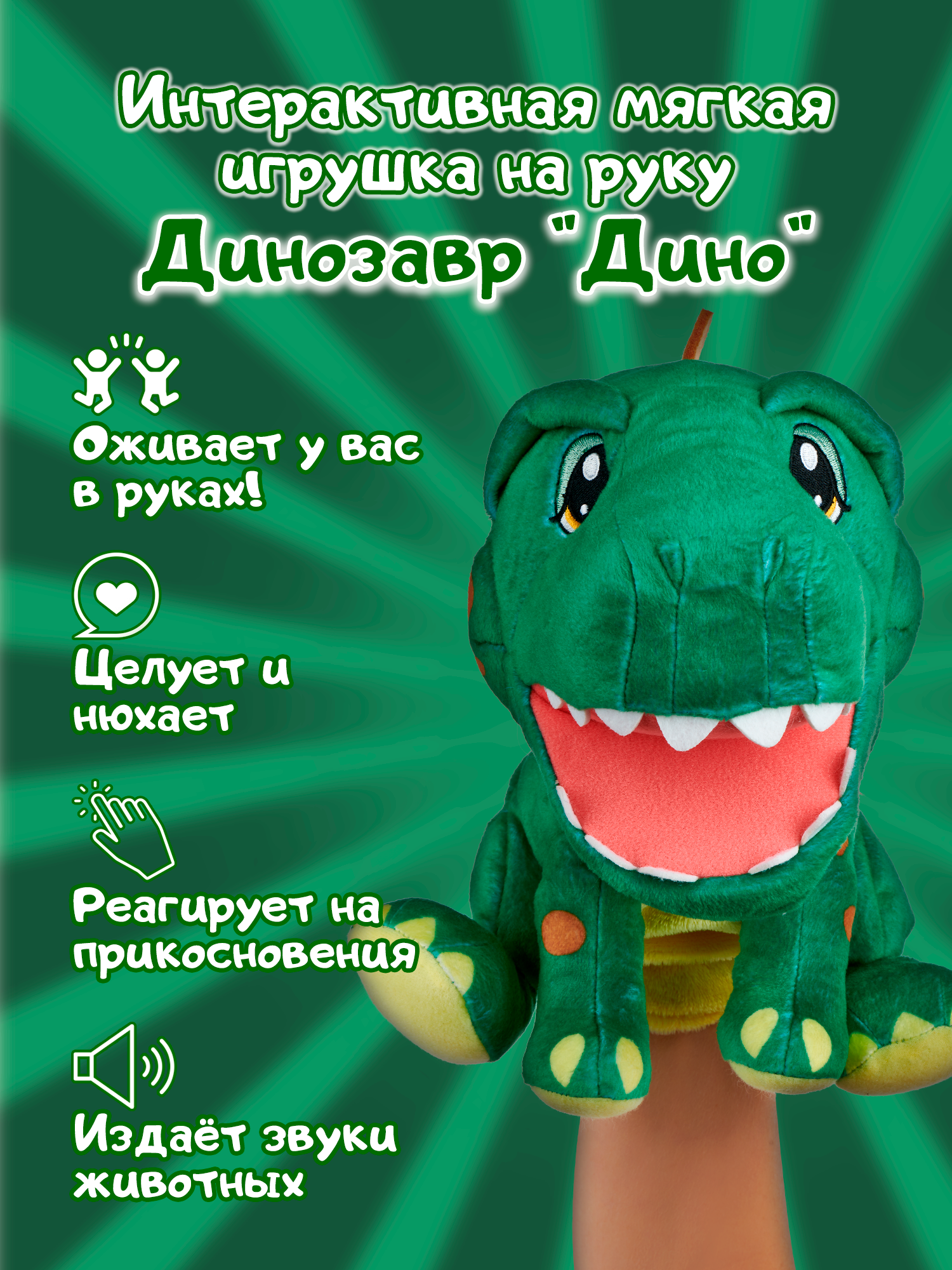 Новинка от WowWee Alive ™ Jr. Play and Say Puppet -интерактивные и говорящие куклы на руку! Динозавр Дино-это очаровательная интерактивная плюшевая игрушка на руку, которая издаёт уникальные звуки животных с помощью сенсорных датчиков, которые реагируют на прикосновения! Открывайте и закрывайте рот снова и снова, чтобы услышать короткие звуки! Раскройте рот игрушки широко, чтобы услышать естественные звуки животного! Откройте рот и коснитесь носика, чтобы услышать звук поцелуя или отрыжки! Закройте рот и коснитесь носика, чтобы услышать звук чихания и обнюхивания!Цены в интернет-магазине могут отличаться от розничных магазинов.