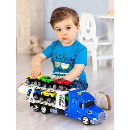 Автовоз с машинками – игрушечный грузовой автомобиль с двухуровневым прицепом и с 6 пикапами.