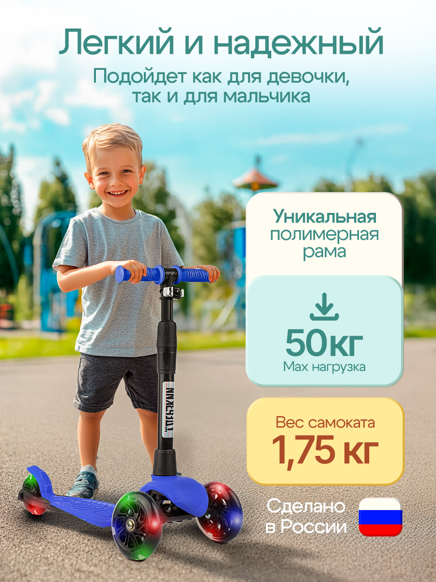 Самокат Дерзкий 1-5 лет BABY Стайл детский трехколесный бесшумный светящиеся колеса синий