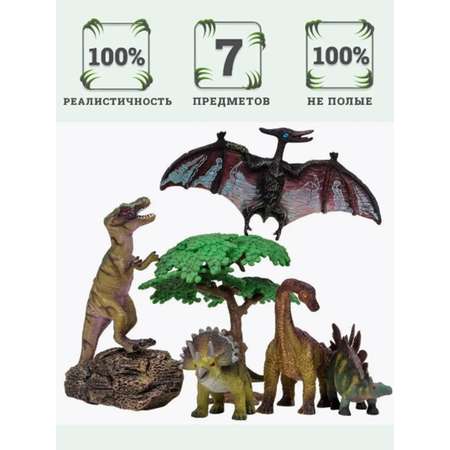 Фигурки динозавров познакомят ребенка с удивительным миром динозавров. Динозавры идеально подходят в качестве обучающего материала и для разнообразных игр детей. Современные технологии позволяют получить максимальное сходство фигурок с предполагаемым прототипом. Дополнительно при разработке каждого животного технологи и дизайнеры консультируются палеонтологами. Фигурки динозавров позволяет еще больше разнообразить сюжет и вдоволь насладиться игрой. Играя, дети не только весело проводят досуг, но и знакомятся с миром животных, расширяют кругозор и словарный запас, развивают мелкую моторику рук и воображение. Игрушки выполнены из высококачественного литого цветного пластика. Игрушка не боится механического воздействия, и надолго сохранят первоначальный внешний вид. Мелкие детали фигурок прорисовываются вручную безопасными и устойчивыми к внешнему воздействию красителями. Данная технология позволяет получить максимальное сходство с вымершими животными. В комплект входит 7 предметов: птеродактили, трицератопс, брахиозавр, тираннозавр, стегозавр, дерево, камень. К набору идеально подойдут другие динозавры бренда, выполненные в едином стиле. Набор идеально подходит и в качестве обучающего материала, и для увлекательных сюжетных игр детей. Игры с фигурками помогут ребенку познакомиться с миром животных, развивают мышление, фантазию, учат бережно относиться к окружающему миру.