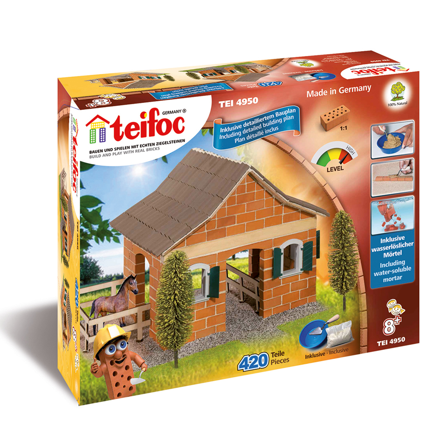 Конструкторы Teifoc - это уникальный симбиоз обучения и игры, в котором используются реальные кирпичики многократного использования и планы строительства для создания забавных и сложных конструкций. Teifoc абсолютно безопасен и подходит для детей. Чтобы растворить цемент, оставьте собранный конструктор в воде на 2 часа. Затем промойте кирпичики, дайте им высохнуть и начните все заново, используя новую цементную смесь, которая состоит из кукурузного крахмала и чистейшего речного песка. Постройте свою собственную конюшню с помощью набора для строительства Teifoc 430 деталей Кирпичики состав: -обожжённая глина Цементная смесь состав: -кукурузный крахмал -речной песок. Мастерок детский -для укладки кирпичиков.Цены в интернет-магазине могут отличаться от розничных магазинов.