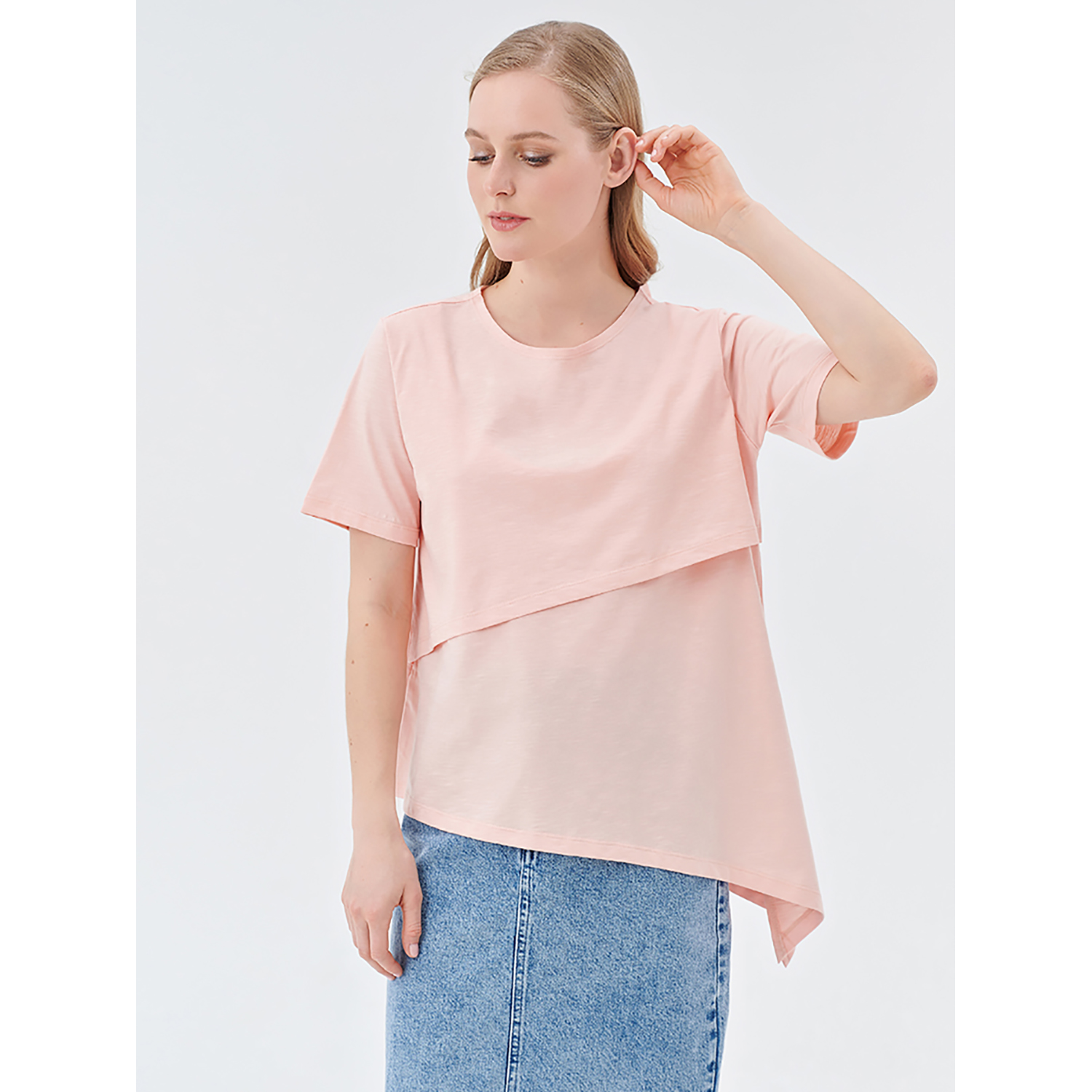 Футболка свободного кроя для кормящих мам сшита из хлопкового трикотажа. Сбоку завязывается на узелок. Под верхней отлетной частью спрятан глубокий вырез, превращающий футболку в удобную для кормления малыша вещь. Рост модели 176см