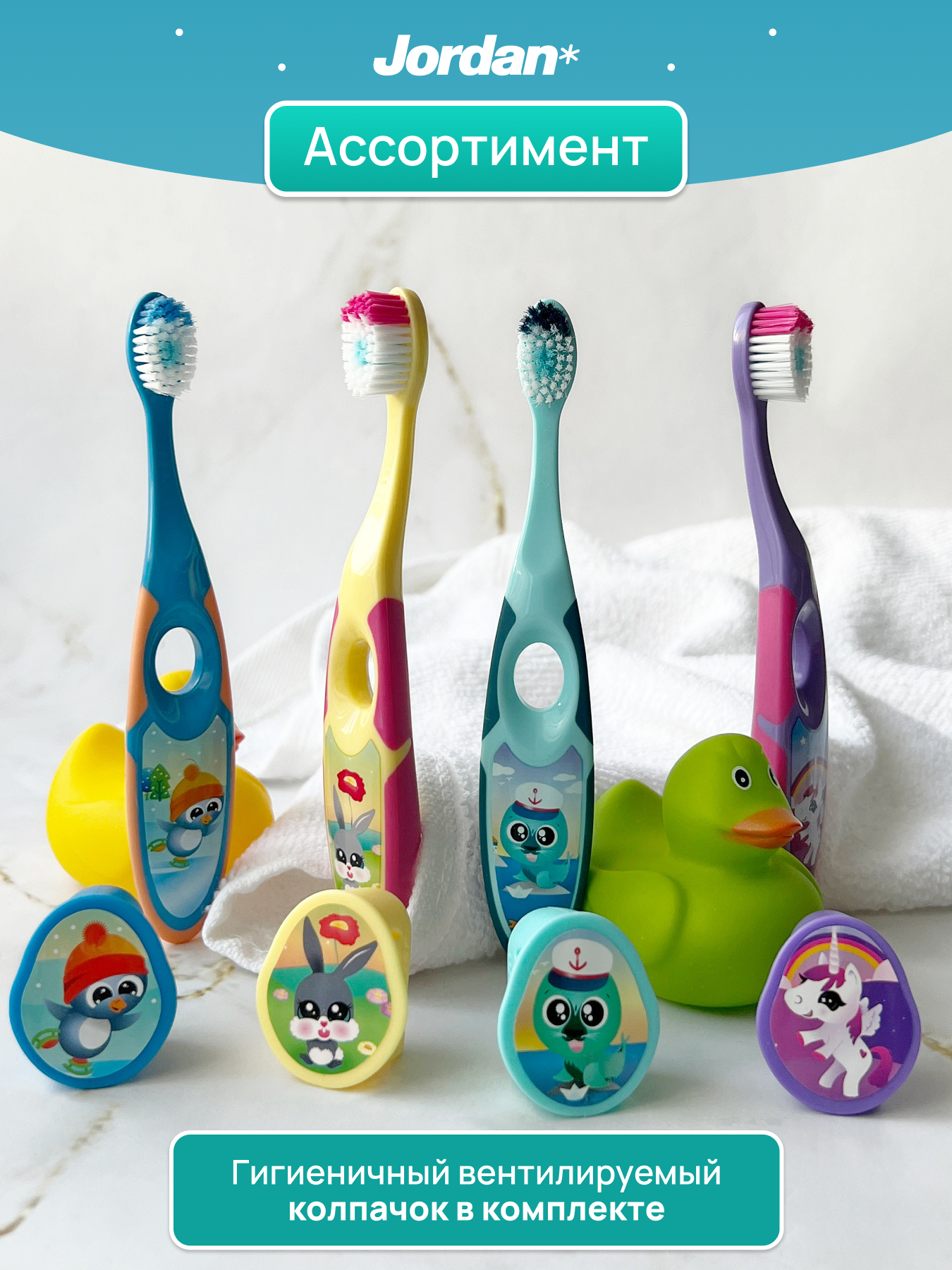 Яркая и интересная мягкая зубная щетка Jordan Step by Step для детей от 3 до 5 лет превратит повседневную чистку зубов Вашего малыша в удовольствие. Она специально разработана для чистки молочных детских зубиков. Имеет мягкую щетину из износостойкого, практически ненамокающего материала. Головка щетки небольшая, но широкая. Рукоятка изготовлена из пищевого пластика и удобна при использовании как детьми, так и для руки взрослого. На щетине имеется индикатор в виде области голубых щетинок, который показывает малышу, сколько зубнойпасты надо наносить. В комплекте с зубной щеткой идет гигиеничный вентилируемый колпачок, обеспечивающий сохранность и чистоту зубной щетки в поездках.