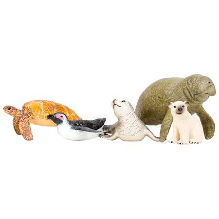 Фигурки ламантина, морской черепахи, тюленя, пингвина, белого медвежонка являются уменьшенными копиями реальных животных. Фигурки выполнены из высококачественного литого цветного пластика. Игрушка не боится механического воздействия, и надолго сохраняет первоначальный внешний вид. Мелкие детали фигурок прорисовываются вручную безопасными и устойчивыми к внешнему воздействию красителями. Данная технология позволяет получить максимальное сходство с животным. В комплект входят: ламантин (15,5х5х6 см), морская черепаха (9,4х4х6,5 см), тюлень (10,5х4,5х6,5 см), пингвин (8х6,2х3 см), белый медвежонок (3х3х4 см). К набору идеально подойдут другие животные бренда, выполненные в едином стиле. Набор идеально подходит и в качестве обучающего материала и для увлекательных сюжетных игр детей. Игры с фигурками помогут ребенку познакомиться с миром животных, развивают мышление, фантазию, учат бережно относиться к окружающему миру. Набор фигурок – прекрасный подарок на День рождения или любой другой праздник.