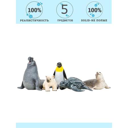Фигурки тюленя, белого медвежонка, пингвина, кожистой черепахи, морского слона являются уменьшенными копиями реальных животных. Фигурки выполнены из высококачественного литого цветного пластика. Игрушка не боится механического воздействия, и надолго сохраняет первоначальный внешний вид. Мелкие детали фигурок прорисовываются вручную безопасными и устойчивыми к внешнему воздействию красителями. Данная технология позволяет получить максимальное сходство с животным. В комплект входят: тюлень (10,5х6,5х4,5 см), белый медвежонок (7х3,5х3,5 см), пингвин (6х3х3,7 см), кожистая черепаха (8х7,5х3 см), морской слон (11,5х5х8,5 см). К набору идеально подойдут другие животные бренда, выполненные в едином стиле. Набор идеально подходит и в качестве обучающего материала и для увлекательных сюжетных игр детей. Игры с фигурками помогут ребенку познакомиться с миром животных, развивают мышление, фантазию, учат бережно относиться к окружающему миру. Набор фигурок – прекрасный подарок на День рождения или любой другой праздник.Цены в интернет-магазине могут отличаться от розничных магазинов.
