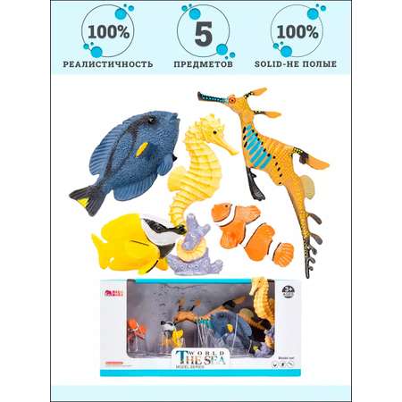 Фигурки рыбки-клоуна, рыбы-лисы, рыбки-хирурга, морского конька, морского дракона являются уменьшенными копиями реальных животных. Фигурки выполнены из высококачественного литого цветного пластика. Игрушка не боится механического воздействия, и надолго сохраняет первоначальный внешний вид. Мелкие детали фигурок прорисовываются вручную безопасными и устойчивыми к внешнему воздействию красителями. Данная технология позволяет получить максимальное сходство с животным. В комплект входят: рыбка-клоун (7х4х3,5 см), рыба-лиса ( 6,5х4х3,5 см), рыбка-хирург (8,5х5х4 см), морской конек (12,5х5,5х3 см), морской дракон (19,5х7х1,5 см). К набору идеально подойдут другие животные бренда, выполненные в едином стиле. Набор идеально подходит и в качестве обучающего материала и для увлекательных сюжетных игр детей. Игры с фигурками помогут ребенку познакомиться с миром животных, развивают мышление, фантазию, учат бережно относиться к окружающему миру. Набор фигурок – прекрасный подарок на День рождения или любой другой праздник.Цены в интернет-магазине могут отличаться от розничных магазинов.
