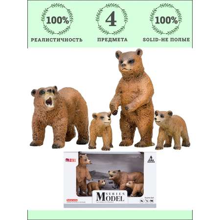 В комплект входят: медведь, медведица, 2 медвежонка. К набору идеально подойдут другие животные бренда, выполненные в едином стиле. Набор идеально подходит и в качестве обучающего материала и для увлекательных сюжетных игр детей. Игры с фигурками помогут ребенку познакомиться с миром животных, развивают мышление, фантазию, учат бережно относиться к окружающему миру.
