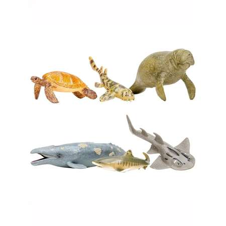 Фигурки ламантина, морской черепахи, серого кита, рохлевого ската, тигровой акулы, кошачьей акулы являются уменьшенными копиями реальных животных. Фигурки выполнены из высококачественного литого цветного пластика. Игрушка не боится механического воздействия, и надолго сохраняет первоначальный внешний вид. Мелкие детали фигурок прорисовываются вручную безопасными и устойчивыми к внешнему воздействию красителями. Данная технология позволяет получить максимальное сходство с животным. В комплект входят: ламантин (15,5x5x6 см), морская черепаха (9,4x6,5x4 см), серый кит (21x8,5x5 см), рохлевый скат (15х8,5х4,3 см), тигровая акула (12х7,5х4 см), кошачья акула (11x6x2 см). К набору идеально подойдут другие животные бренда, выполненные в едином стиле. Набор идеально подходит и в качестве обучающего материала и для увлекательных сюжетных игр детей. Игры с фигурками помогут ребенку познакомиться с миром животных, развивают мышление, фантазию, учат бережно относиться к окружающему миру.