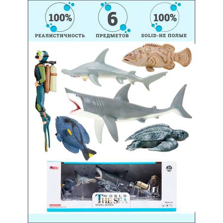 Фигурки акулы, рыбы-хирурга, кожистой черепахи, акулы, рыбы групер являются уменьшенными копиями реальных животных. Фигурки выполнены из высококачественного литого цветного пластика. Игрушка не боится механического воздействия, и надолго сохраняет первоначальный внешний вид. Мелкие детали фигурок прорисовываются вручную безопасными и устойчивыми к внешнему воздействию красителями. Данная технология позволяет получить максимальное сходство с животным. В комплект входят: акула (19х11,5х6,5 см), рыба-хирург (8,5x4х4 см), кожистая черепаха (8х3х7,5 см), акула-молот (16х5х6,5 см), рыба групер (11x4,5x4 см), дайвер (8х2,5х2,х4 см). К набору идеально подойдут другие животные бренда, выполненные в едином стиле. Набор идеально подходит и в качестве обучающего материала и для увлекательных сюжетных игр детей. Игры с фигурками помогут ребенку познакомиться с миром животных, развивают мышление, фантазию, учат бережно относиться к окружающему миру.