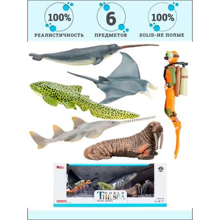 Фигурки манты, нарвала, моржа, рыбы-пилы, акулы-зебры являются уменьшенными копиями реальных животных. Фигурки выполнены из высококачественного литого цветного пластика. Игрушка не боится механического воздействия, и надолго сохраняет первоначальный внешний вид. Мелкие детали фигурок прорисовываются вручную безопасными и устойчивыми к внешнему воздействию красителями. Данная технология позволяет получить максимальное сходство с животным. В комплект входят: манта (15x15x2,3), нарвал, морж (9,5x8x5 см ), рыба-пила (17 х5х3,8 см), акула-зебра (11x5,5x2,5 см), дайвер (8х2,5х2,5 см). К набору идеально подойдут другие животные бренда, выполненные в едином стиле. Набор идеально подходит и в качестве обучающего материала и для увлекательных сюжетных игр детей. Игры с фигурками помогут ребенку познакомиться с миром животных, развивают мышление, фантазию, учат бережно относиться к окружающему миру.