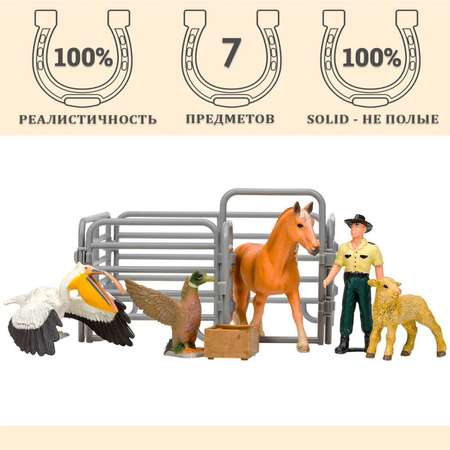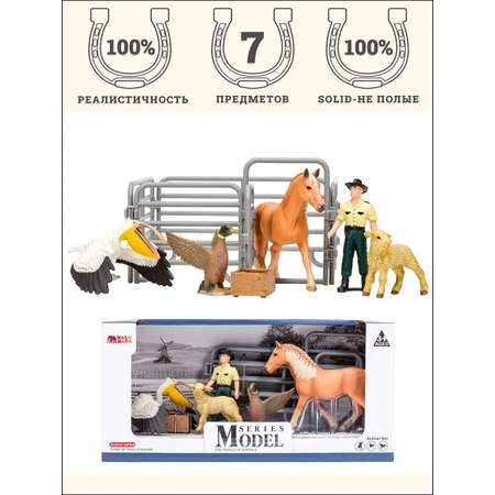 Набор фигурок являются уменьшенными копиями реальных животных, людей и зданий. Все предметы игрового набора выполнены из высококачественного литого цветного пластика. Игрушка не боится механического воздействия, и надолго сохранят первоначальный внешний вид. Мелкие детали фигурки прорисовываются вручную безопасными и устойчивыми к внешнему воздействию красителями. Под ногами фигурок имеется имитация земли/травы для большей устойчивости фигурки. Данная технология позволяет получить максимальное сходство с реальными животными. В комплект входит 7 предметов: лошадь, лошадь (13x3,5x10 см), ягненок (7x2,5x5 см), утка (6x6x5,5 см), пеликан (13x7x9 см), фигурка фермера (6х3х3 см), ящик (4х3,5х2 см), загон (10х15х15 см). К набору идеально подойдут другие животные бренда, выполненные в едином стиле. Набор идеально подходит и в качестве обучающего материала и для увлекательных сюжетных игр детей. Игры с фигурками помогают ребенку познакомиться с животными на ферме, развивают мышление, фантазию, учат бережно относиться к окружающему миру.
