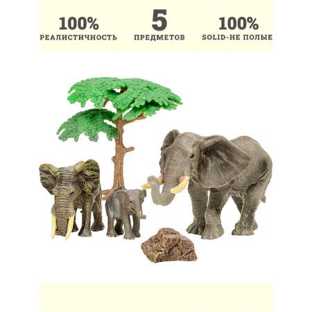 В комплект входят: слон (18х9х9 см), слониха (11х4х7 см), cлоненок (9х3,5х5 см), дерево (10х3х2 см), камень (4х4х2 см). К набору идеально подойдут другие животные бренда, выполненные в едином стиле.