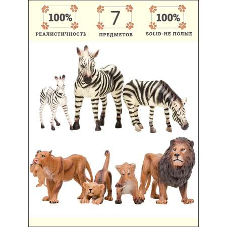В комплект входят: лев (13,4х4х8 см), львица (13х3х6 см), 2 львенка (8,5х3,4х5 см 9х2,5х6 см), дерово (10х3х2 см), 2 зебры (12х2,5х7 см; 12х3х13 см), зебренок (8х2х8 см), дерево (10х3х2 см), камень (4х4х2 см).