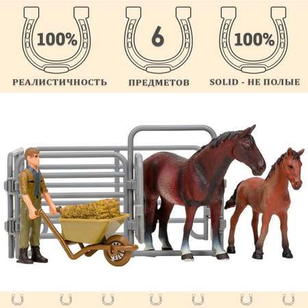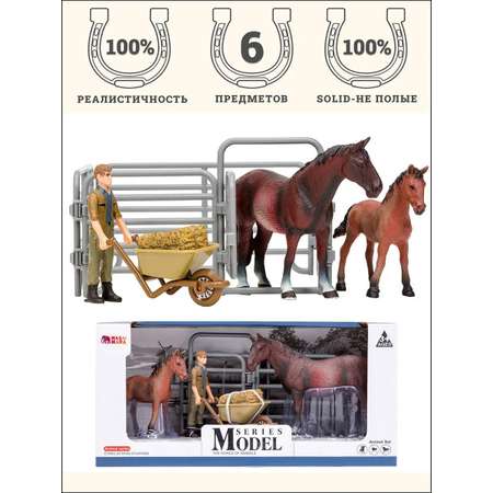 абор фигурок являются уменьшенными копиями реальных животных, людей и зданий. Все предметы игрового набора выполнены из высококачественного литого цветного пластика. Игрушка не боится механического воздействия, и надолго сохранят первоначальный внешний вид. Мелкие детали фигурки прорисовываются вручную безопасными и устойчивыми к внешнему воздействию красителями. Под ногами фигурок имеется имитация земли/травы для большей устойчивости фигурки. Данная технология позволяет получить максимальное сходство с реальными животными. В комплект входит 6 предметов: конь (13,5х10,5х4 см), жеребенок (10х3х9 см), фигурка фермера (8х3х3 см), тележка (7х3,5х3,5 см), сено (4х3х2 см), загон (10х15х15 см). К набору идеально подойдут другие животные бренда, выполненные в едином стиле. Набор идеально подходит и в качестве обучающего материала и для увлекательных сюжетных игр детей. Игры с фигурками помогают ребенку познакомиться с животными на ферме, развивают мышление, фантазию, учат бережно относиться к окружающему миру. Набор фигурок – прекрасный подарок на День рождения или любой другой праздник.Цены в интернет-магазине могут отличаться от розничных магазинов.