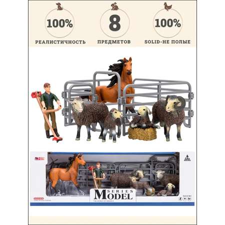 Набор фигурок являются уменьшенными копиями реальных животных, людей и зданий. Все предметы игрового набора выполнены из высококачественного литого цветного пластика. Игрушка не боится механического воздействия, и надолго сохранят первоначальный внешний вид. Мелкие детали фигурки прорисовываются вручную безопасными и устойчивыми к внешнему воздействию красителями. Под ногами фигурок имеется имитация земли/травы для большей устойчивости фигурки. Данная технология позволяет получить максимальное сходство с реальными животными. В комплект входит 8 предметов: овцы 4 шт. (10х7,5х5 см, 7х9х4 см, 5х7х2,5 см, 6,5х4х2,5 см), лошади (15x5x11 см), фигурка фермера (6х3х3 см), сено (4х3х2 см), газонокосилка (6х3х3 см), загон (10х15х15 см). К набору идеально подойдут другие животные бренда, выполненные в едином стиле. Набор идеально подходит и в качестве обучающего материала и для увлекательных сюжетных игр детей. Игры с фигурками помогают ребенку познакомиться с животными на ферме, развивают мышление, фантазию, учат бережно относиться к окружающему миру.