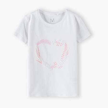 Белая футболка для девочки выполнена из качественного хлопкового трикотажа. Имеет круглый вырез горловины, короткие рукава и украшена нежным тактильным принтом. Благодаря качественному материалу и грамотному крою, изделие максимально комфортно для ребенка.