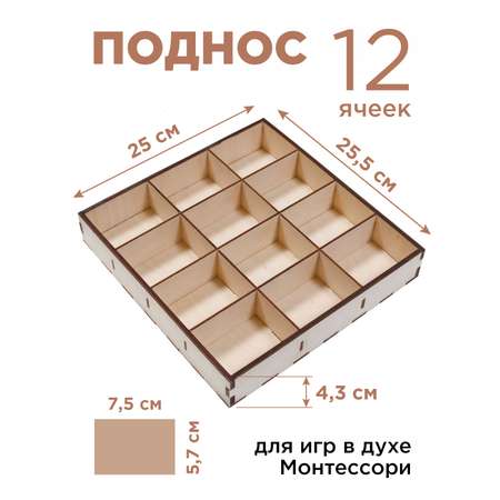 Деревянный поднос с 12-ю отделами для сортировки и хранения. Помогает развивать координацию движений, аккуратность и стремление к порядку. Подходит для игр любыми сортерами Уланик. Отличная игрушка для творчества.