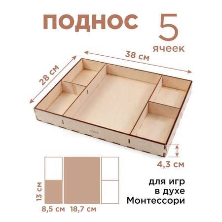 Деревянный поднос с 5-ю отделами для игры с любыми сортерами Ulanik. Хорошо подходят для детей любого возраста. Помогает развивать координацию движений, аккуратность и стремление к порядку. Материал изготовления - фанера. Поднос не рекомендуется мыть под струей воды. Древесина - чувствительный к влаге материал. Можно протереть его влажной тканью.