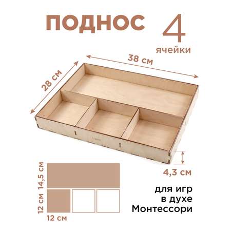 Деревянный поднос с 4-мя отделами для игры с любыми сортерами Ulanik. Хорошо подходят для детей любого возраста. Помогает развивать координацию движений, аккуратность и стремление к порядку. Материал изготовления - фанера. Поднос не рекомендуется мыть под струей воды. Древесина - чувствительный к влаге материал. Можно протереть его влажной тканью.