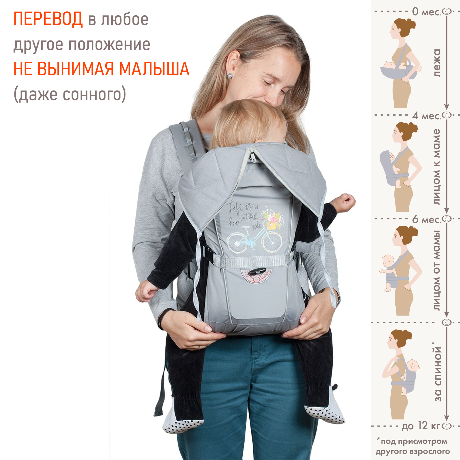 | Положение ребёнка: | лёжа, спереди лицом к родителю, спереди спиной к родителю, за спиной родителя |