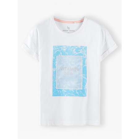 Модель выполнена из хлопкового трикотажа. Детали: - круглый вырез; - свободный крой; - короткие рукава; - оригинальный принт на полочке; - белый цвет позволяет сочетать футболку с любыми шортами, джинсами, юбками.
