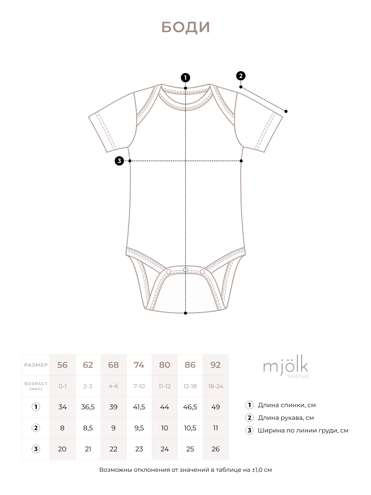 Боди для новорожденных с коротким рукавом Mjolk [мьёльк] - незаменимая часть детской одежды, особенно в первые месяцы жизни малышей. Этот комплект одежды идеально подходит как для мальчиков, так и для девочек, обеспечивая комфорт и удобство. Боди для малышей, девочек или мальчиков, изготовлено из высококачественного трикотажа, который приятен на ощупь и позволяет коже дышать. Благодаря использованию натурального хлопка, бодик не вызывает раздражения и аллергии. Детские вещи станут отличным выбором для родителей, которые ищут практичную и удобную одежду для своего малыша. Этот элемент детской одежды легко сочетается с различными элементами гардероба. Детские боди идеально подходят для младенцев до года, а также могут быть использованы в качестве одежды для выписки из роддома. Короткий рукав делает этот вид одежды подходящим для разных сезонов и температурных условий. В нашем ассортименте представлена детская одежда для новорожденных девочек и мальчиков. Вы сможете подобрать идеальный вариант в зависимости от ваших предпочтений и вкусов вашего ребенка. Не упустите возможность приобрести качественные и стильные вещи для своего новорожденного младенца. С нашей одеждой ваш ребенок будет чувствовать себя комфортно и уютно на протяжении всего дня, а вы будете гордиться своим выбором! Материал тонкий, нежный, эластичный, дышит и не вызывает аллергии. Изделие растягивается по фигуре, ребёнку в нём не жарко, он не потеет. В вещах можно играть и спать, поддевать его под комбинезон или спальный мешок. Кнопки находятся выше их привычного расположения, поэтому застегнуть изделие проще. С планочкой внахлёст можно надевать через ножки. Сперва нужно застегнуть кнопочки внизу и собрать вещь гармошкой. Потом продеть в неё ножки, а затем и ручки. Модель хорошо садится на худеньких малышей, а деткам покрупнее мы рекомендуем брать на размер побольше, чтобы носить изделие дольше. Произведено вручную в СПб. Перед использованием обязательна предварительная машинная стирка при 40 градусах.