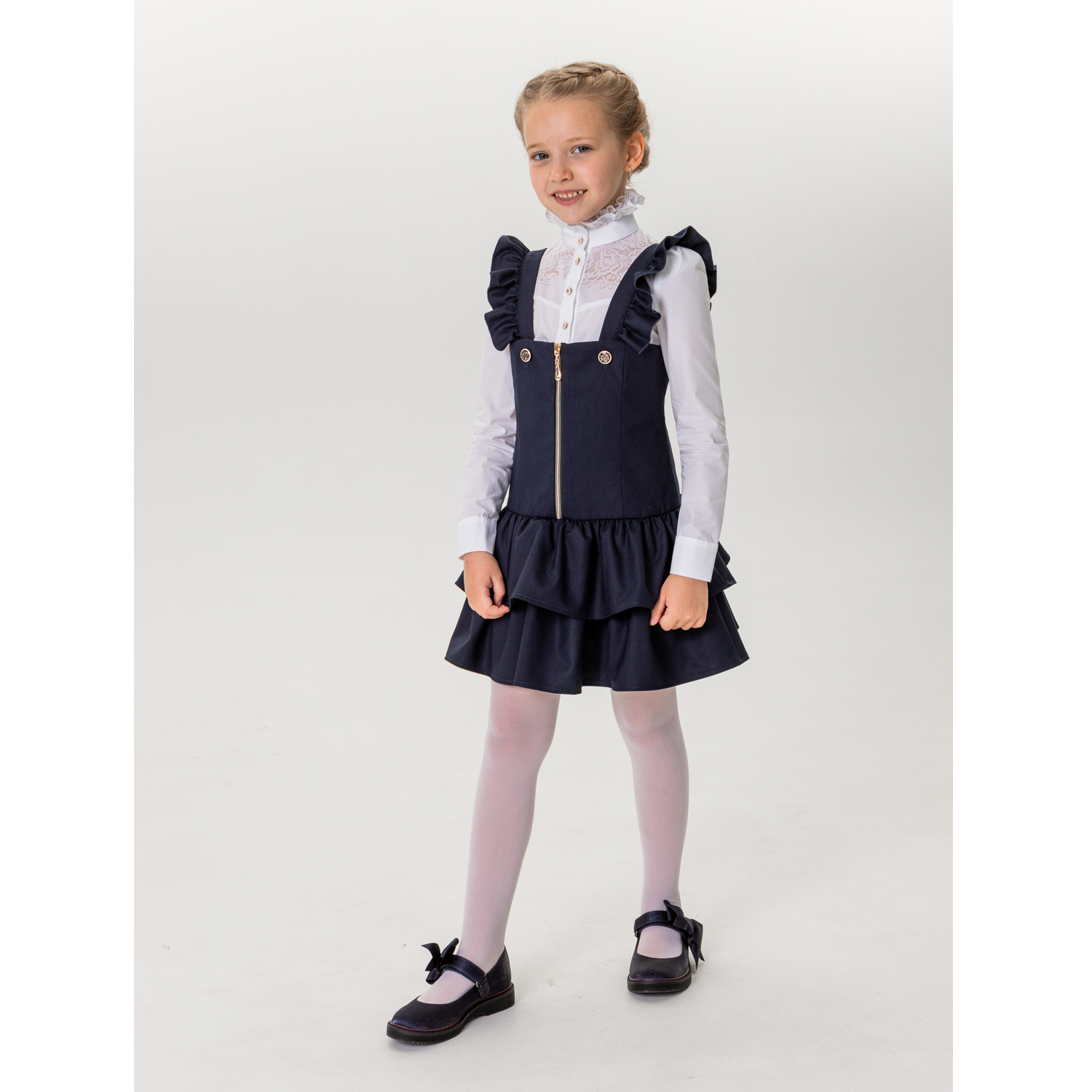 Желаете одеть своего ребенка с утонченным вкусом и неповторимым стилем? Этот изысканный школьный сарафан именно для Вас. Эта модель продумана до мелочей для того, чтобы Ваш ребенок чувствовал себя уверенно и комфортно каждый день. Сарафанчик выполнен из высококачественной дышащей ткани, в которой ребенку будет не жарко в классе. Приталенный корсет и пышная двухъярусная юбочка подчеркнет красивую фигурку девочки. При желании талию можно немного затянуть на спинке хлястиком, украшенным милым бантиком. Кокетливые бретели-крылышки регулируются по длине под рост Вашего ребенка путем перешивания пуговицы. По центру переда проходит красивая декоративная золотистая молния - удачное сочетание с золотистыми пуговицами, придающими изделию дорогой респектабельный вид. Внутри лифа кружевная поливискозная тонкая подкладка. В школу с удовольствием за отличными оценками!