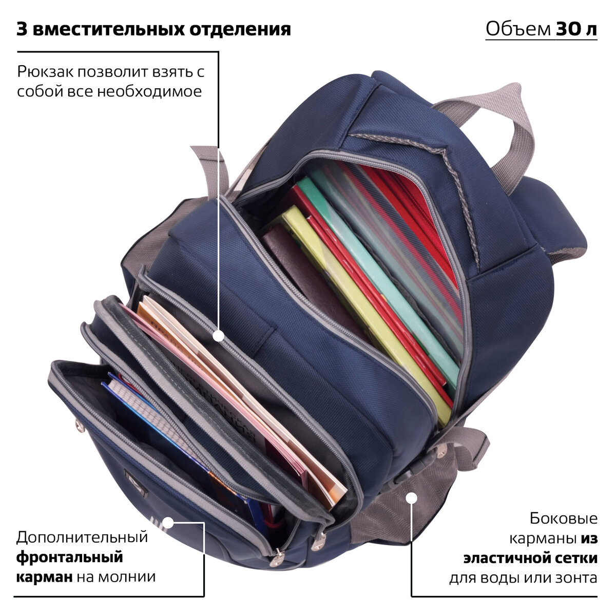 Рюкзак BRAUBERG HIGH SCHOOL "Старлайт" универсальный, синий/серый – это идеальный выбор для тех, кто ценит комфорт и стиль. Этот рюкзак прекрасно подходит как для девочек, так и для мальчиков, благодаря сочетанию лаконичного дизайна и практичности. Два вместительных отделения и множество карманов позволяют оптимально организовать пространство, что делает его отличным школьным рюкзаком. Рюкзак изготовлен из высококачественных материалов, устойчивых к износу, что делает его долговечным и надежным. Формоустойчивая спинка и эргономичные регулируемые плечевые ремни обеспечивают комфорт при ношении, а мягкая ручка позволяет носить рюкзак и в руках. Боковые карманы из эластичной сетки подходят для хранения бутылок с водой или зонта, а фронтальный карман на молнии обеспечивает быстрый доступ к необходимым вещам. Светоотражающий элемент на передней панели повышает безопасность на дороге. Объем 30 литров и возможность уплотнения боковыми ремнями делают этот рюкзак идеальным для повседневного использования и учебы. Если вы ищете рюкзак, который будет удобным и функциональным подарком для мужчины или девушки, школьный рюкзак BRAUBERG HIGH SCHOOL – ваш выбор. • Пол: унисекс. • Серия: HIGH SCHOOL. • Объем: 30 л. • Количество отделений: 3. • Регулируемые лямки: да. • Перегородка в основном отделении: да. • Количество карманов: 4 шт. • Фронтальный карман: да. • Боковые карманы: да. • Наличие ручки для переноса: да. • Вентилируемые лямки: да. • Ремни для утягивания основного отделения: да. • Материал: полиэстер. • Цвет: синий/серый. • Дизайн: Старлайт. • Высота: 46 см. • Ширина: 34 см. • Глубина: 18 см. • Длина лямок: 84.5 см. • Вес: 0.8 кг. • Артикул производителя: 226342.Цены в интернет-магазине могут отличаться от розничных магазинов.
