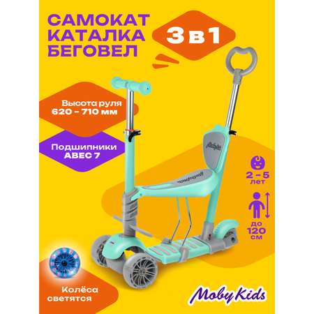 Самокат трехколесный Moby Kids Pony 3 в 1 светящиеся колеса. Мятный