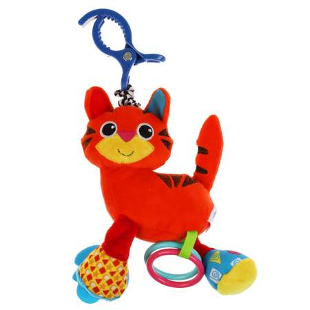 Эта игрушка в виде милого тигра с забавным вибрационным эффектом и весело гремящими шариками непременно приведёт ребёнка в восторг. Подвеска выполнена в ярких цветах из очень мягкого и гипоаллергенного материала. Благодаря креплению-клипсе игрушку удобно крепить к кроватке, коляске или дуге. Прорезыватель интересной формы из качественного безопасного материала пригодится малышу, когда у него будут резаться зубки.